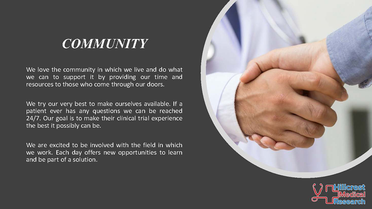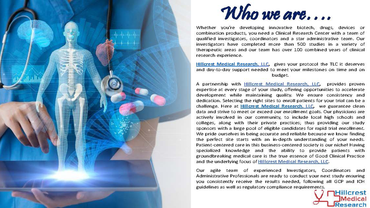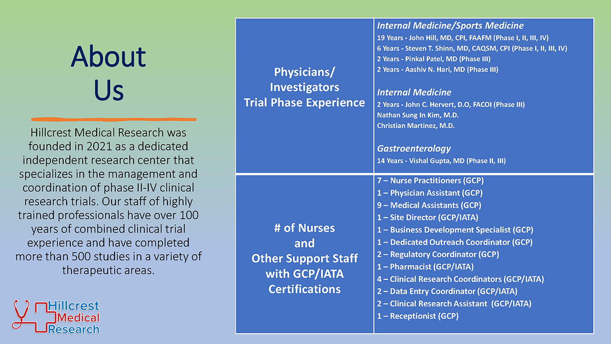 Hillcrest Medical Research is the right Clinical Research Center to support your next clinical trial!