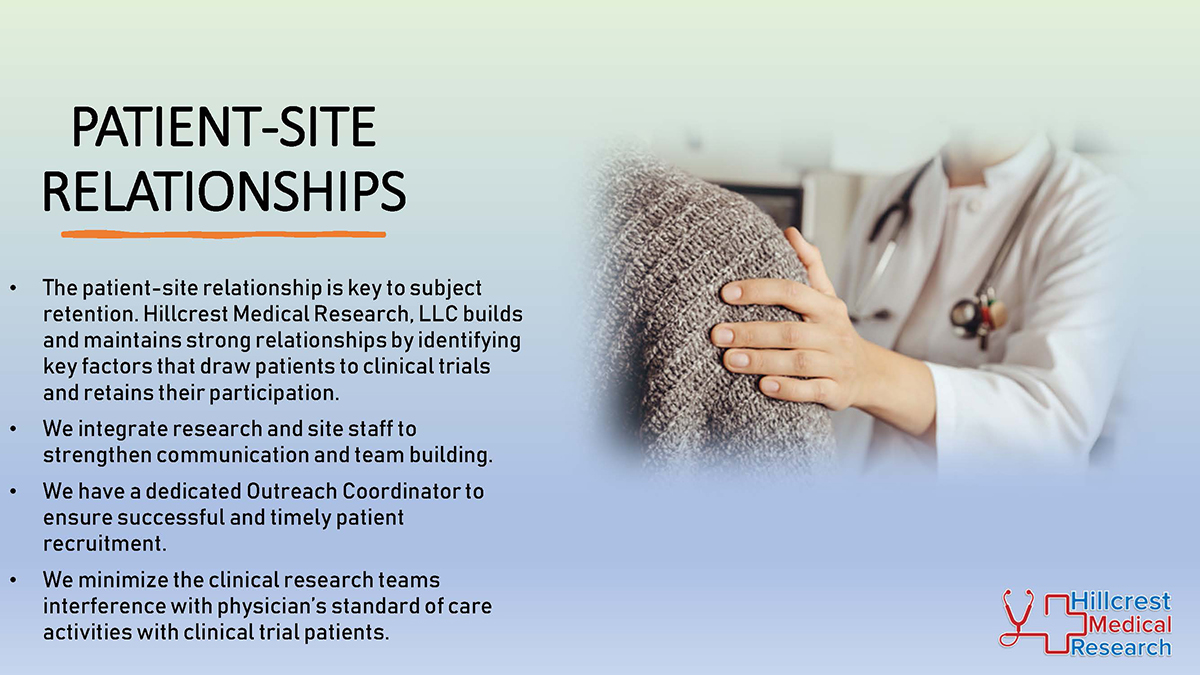 A partnership with Hillcrest Medical Research provides proven expertise at every stage of a study, offering opportunities to accelerate development while maintaining quality. We ensure consistency and dedication. Selecting the right sites to enroll patients for trial can be a challenge. Here at Hillcrest Medical Research we guarantee to be high performing. Our investigators conduct research at our patient care sites, which provide our study sponsors with a large pool of eligible candidates for rapid trial enrollment. We pride ourselves in being able to provide ongoing reliability because we know finding the perfect site starts with an in-depth understanding of needs. Patient-centered care in this business-centered society is our niche! Having knowledge and the ability to provide patients with groundbreaking medical care is the true essence of Good Clinical Practice