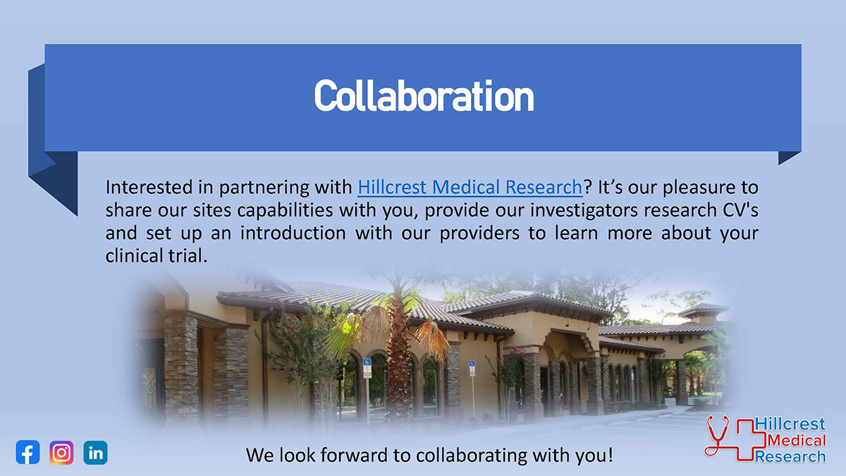 Hillcrest Medical Research is the right Clinical Research Center to support your next clinical trial!